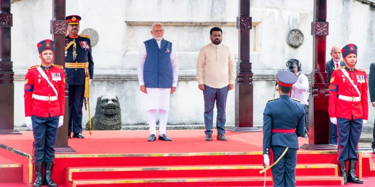 இந்திய பிரதமர் நரேந்திர மோடிஇ குதிரைப்படையை முன்னிலையாக கொண்டு சுதந்திர சதுக்க வளாகத்திற்கு அழைத்து வரப்பட்டதை தொடர்ந்து ஜனாதிபதி அநுர குமார திசாநாயக்கவினால் இந்திய பிரதமருக்கு சிறப்பு வரவேற்பளிக்கப்பட்டது.
