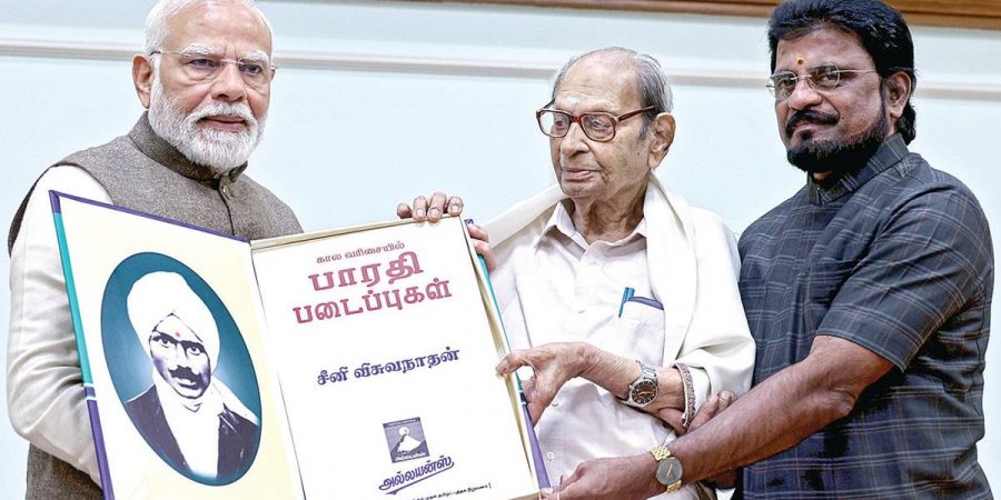மத்திய கலாச்​சாரத் துறை​யின் கீழ் அமைந்​துள்ள சாகித்ய அகாடமி சார்​பில் பிரதமரின் அரசு இல்லத்​தில் இதற்கான நிகழ்ச்சி நேற்று கோலாகலமாக நடைபெற்​றது. கால வரிசை​யில் பாரதி படைப்புகள் என்ற பெயரில் தமிழில் வெளி​யிடப்​பட்ட இந்நூல்களை சீனி விசுவ நாதன் தொகுத்​துள்ளார். இந்த நிகழ்ச்​சி​யில் மத்திய கலாச்​சாரத் துறை அமைச்சர் கஜேந்​திரசிங் ஷெகாவாத், நாடாளு​மன்ற விவகாரத்​துறை இணையமைச்சர் எல்.​முருகன் உள்ளிட்​டோர் கலந்து கொண்​டனர்.