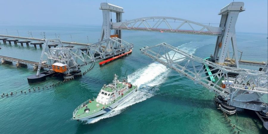 பிரதமரின் திறப்பு விழா நிகழ்வுக்காக பாம்பன் புதிய ரயில் பாலத்தில் சோதனை