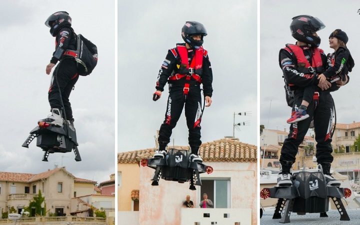 பிரான்ஸில் ராணுவ வீரரான பிரான்க் ஜபாதா என்பவர் தானே சுய முயற்சியில் தயாரித்த ‘ஃபிளைபோட்’ என்ற ஜெட் உந்துசக்தியிலான மிதவையில் பறந்து சாகசத்தில் ஈடுபட்டுள்ளார்.