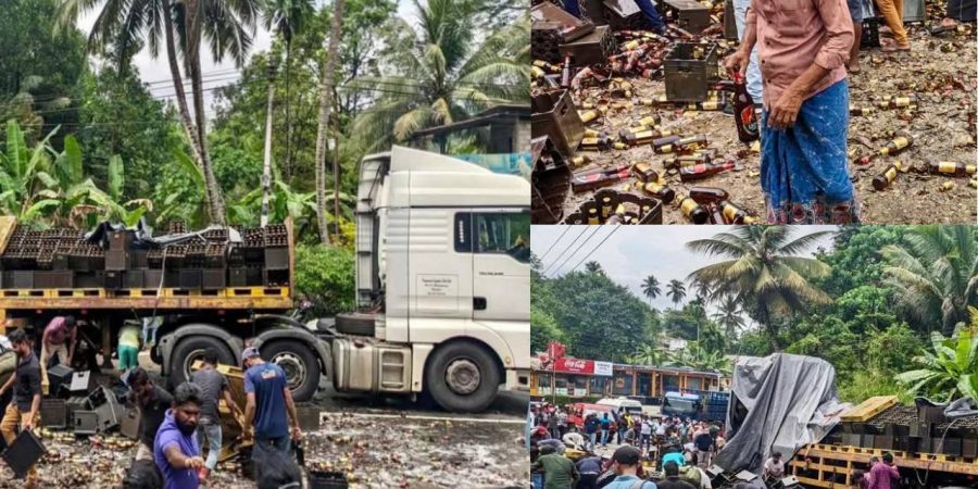 விபத்தைத் தொடர்ந்து, பீர் போத்தல்கள் வீதியில் சிதறிக் கிடந்தன.