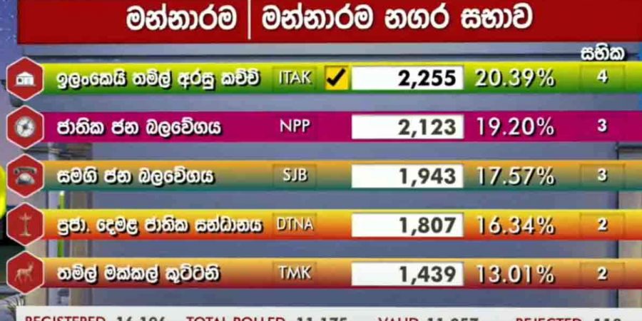 மன்னார் நகர சபையில் இலங்கை தமிழரசு கட்சி வெற்றி பெற்றுள்ளது.