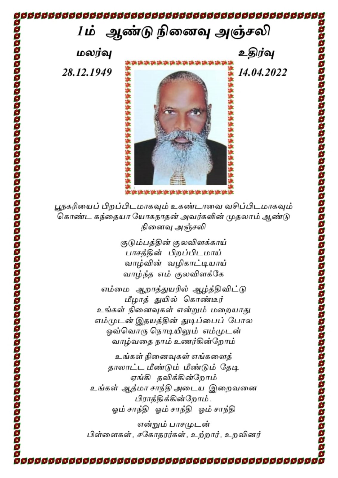 தாயகத்தில் பூநகரியை பிறப்பிடமாகவும், உகண்டாவை வசிப்பிடமாகவும் கொண்டிருந்த திரு.கந்தையா யோகநாதன் அவர்களுடைய 14 ஆம் திகதி ஏப்ரல் மாதம் வெள்ளிக்கிழமை அன்று வந்த முதலாம் ஆண்டு நினைவு தினத்தை 15ம் திகதி ஏப்ரல் மாதம் சனிக்கிழமை இன்று வானலைக்கு எடுத்து வருகின்றார்கள்.