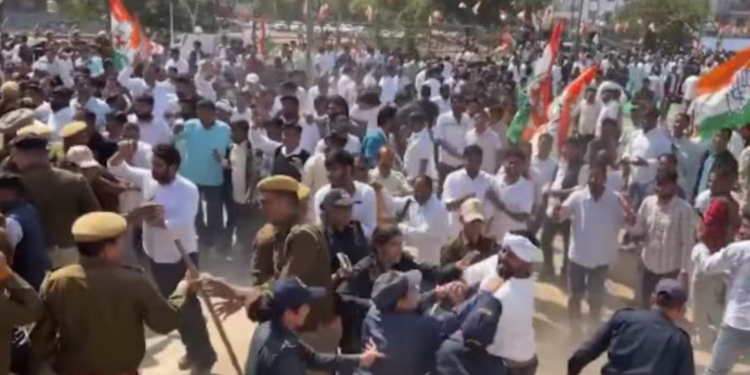 ஜெய்ப்பூரில் உள்ள ராஜஸ்தான் சட்டசபைக்கு வெளியே காங்கிரஸ் தொண்டர்கள் திங்கள்கிழமை (24) மாபெரும் ஆர்ப்பாட்டத்தில் ஈடுபட்டனர்.