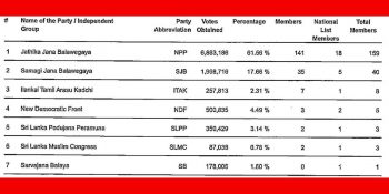 நடைபெற்ற பாராளுமன்ற தேர்தலில் இதுவரை வௌியான முடிவுகளின் அடிப்படையில் தேசிய மக்கள் சக்தி (NPP) மொத்தம் 123 இடங்களை வென்றுள்ளது. கம்பஹா மாவட்டத்தில் 19 ஆசனங்களில் 16 ஆசனங்களைக் கைப்பற்றியதன் பின்னர், தேசிய மக்கள் சக்தியின் பெரும்பான்மை பலம் உறுதியாகியுள்ளது. இதுவரைமேலும் படிக்க...